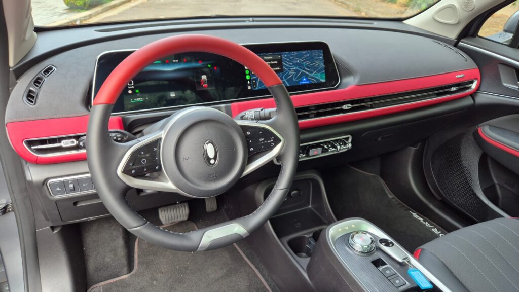 Por dentro, não há mudanças, o Ora 03 GT continua com acabamento escurecido com vermelho, destacando esportividade. O modelo continua com duas amplas telas de 10,25 polegadas cada, sendo uma de painel digital e outra de multimídia, que ganhou conexão do aplicativo My GWM, permitindo mexer em várias funções do veículo.