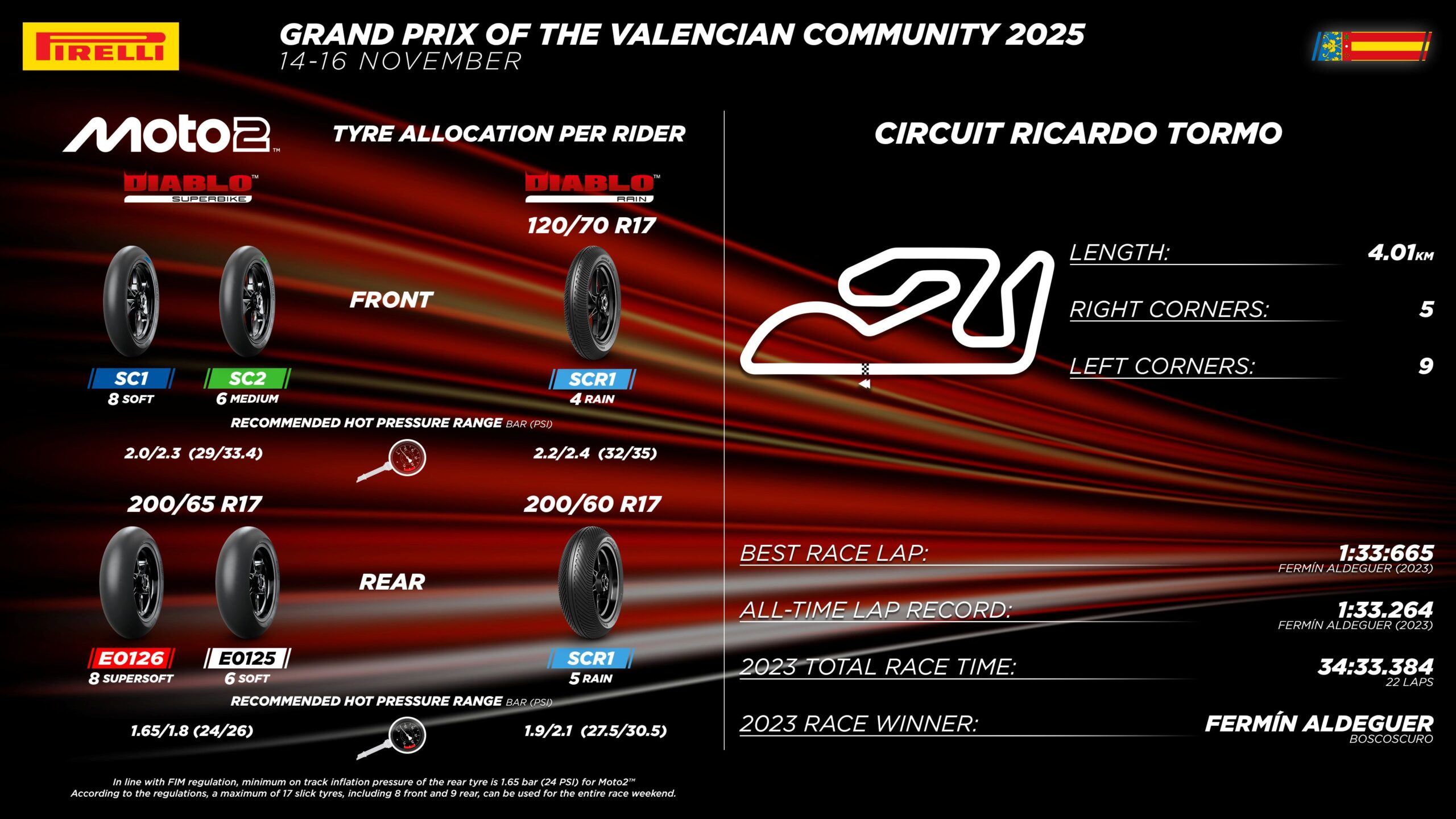 O GP da Comunidade Valenciana é a última etapa do Campeonato Mundial de Motovelocidade de 2025 e, ao mesmo tempo, marca a estreia da Pirelli nesse circuito, já que a fabricante italiana de pneus nunca havia competido no Circuito Ricardo Tormo, em Valência, nas categorias Moto2 e Moto3. Para os pilotos da Moto2, retornam à cena o pneu traseiro supermacio na especificação E0126, que estreou no GP da Áustria, e o macio na especificação E0125, ambos amplamente apreciados e utilizados pelos pilotos da categoria intermediária. Trata-se de duas soluções de desenvolvimento que compartilham a mesma estrutura aplicada aos compostos de suas respectivas opções padrão. Os dois pneus traseiros podem ser combinados com duas opções dianteiras: o macio SC1 e o médio SC2, ambas soluções padrão.
